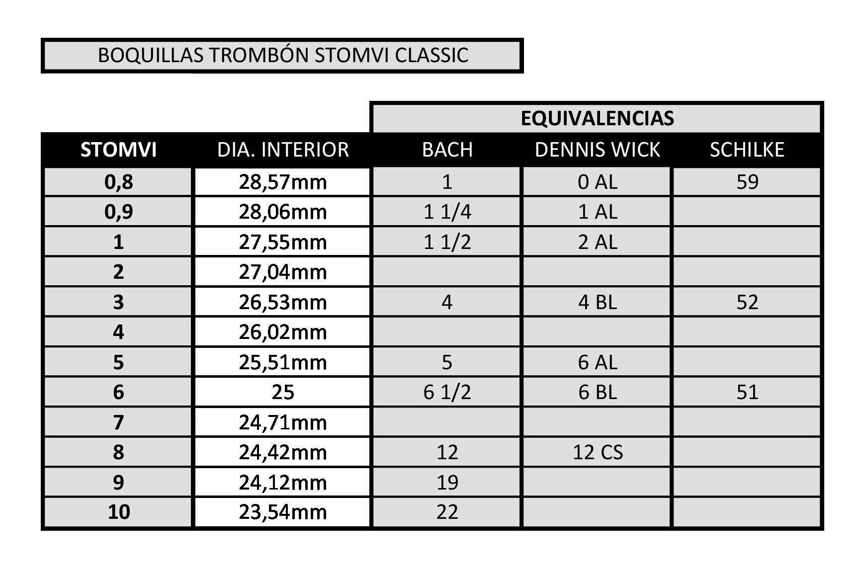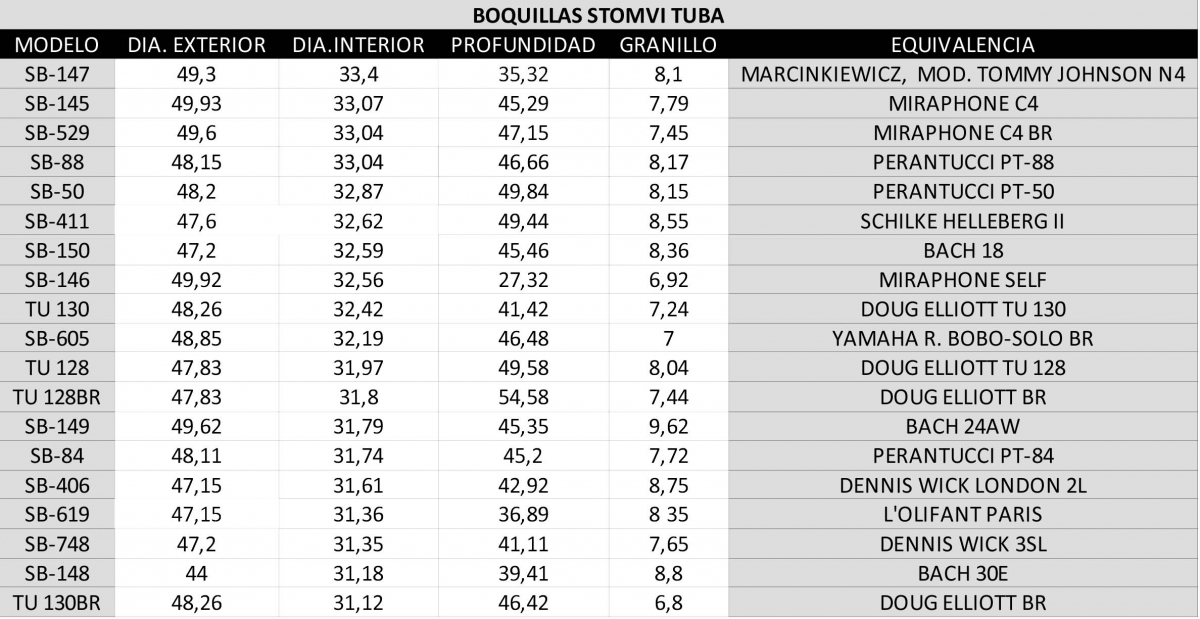 Stomvi trombone mouthpieces equivalences