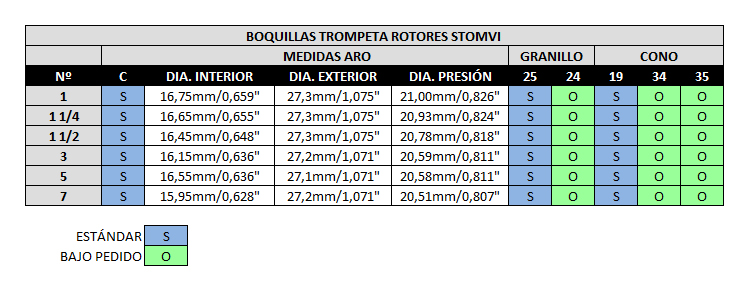 Ref. 8600El complemento ideal para la trompeta de rotores. Diseñada cuidadosamente para proporcionar las máximas prestaciones preservando la esencia y la tradición.Tabla equivalencias boquillas trompeta rotores: